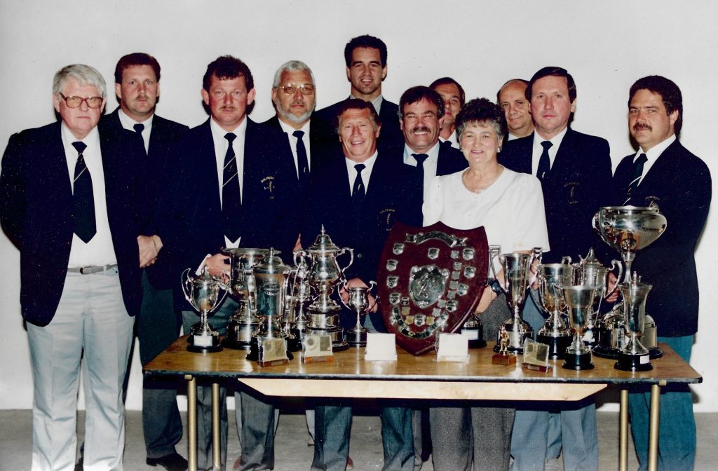 Agter: Kippie Immelman(add. Lid), Lourens de Jongh(tesourier), Pierre Chamberlain(afrigter), Ferdie Behm(add. Lid) en Sonnie Basson(klubkaptein)